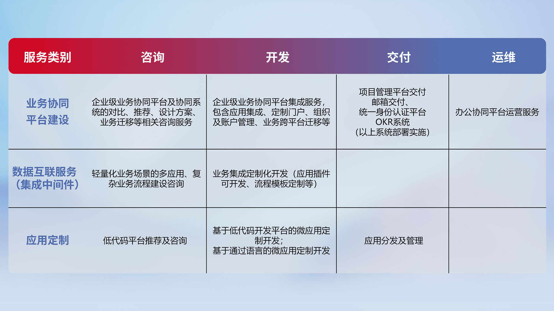 针对钉钉、、、企微、、、、IDaas等平台级产品提供产品的规划、、、方案、、、、交付、、定制化开发等服务,,实现如统一协同办公、、、、智能客户服务、、混合会议管理、、智能数据查询、、等业务场景,,实现数字化转型。。。