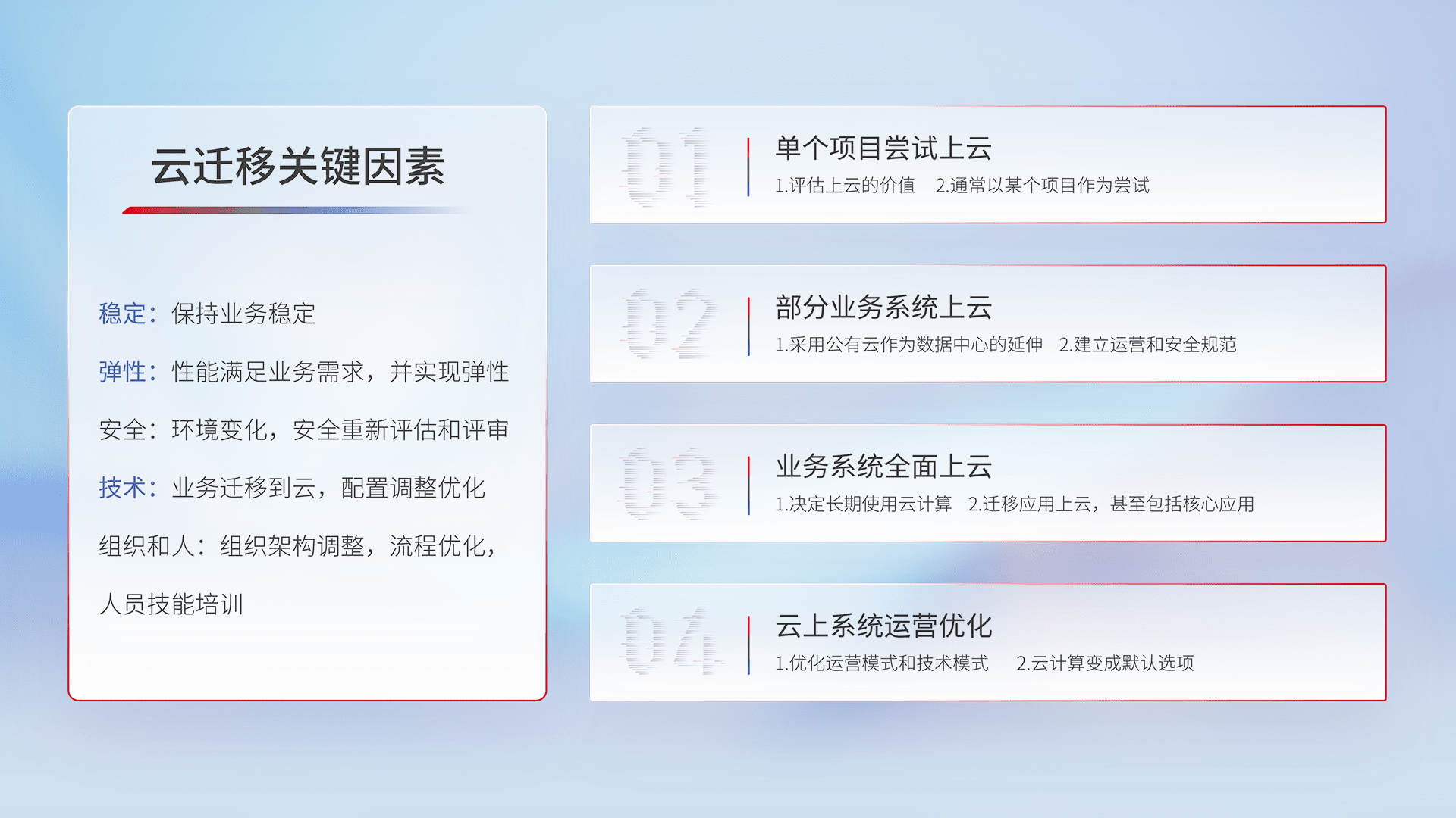 结合实际业务,,,从规划设计、、、云平台选型、、、云原生改造、、、数据迁移、、、、集成交付,,,迁移全过程为客户识别最佳上云路径,,,,做好风险识别管理,,,设计网络架构、、、、身份权限、、安全审计合规、、、操作审计、、、日志审计、、监控告警策略、、、多站点容灾设计等,,,对云上基础设施进行整体规划,,,,提升IT治理水平,,以满足弹性、、、、高可用、、、高性能的需求。。