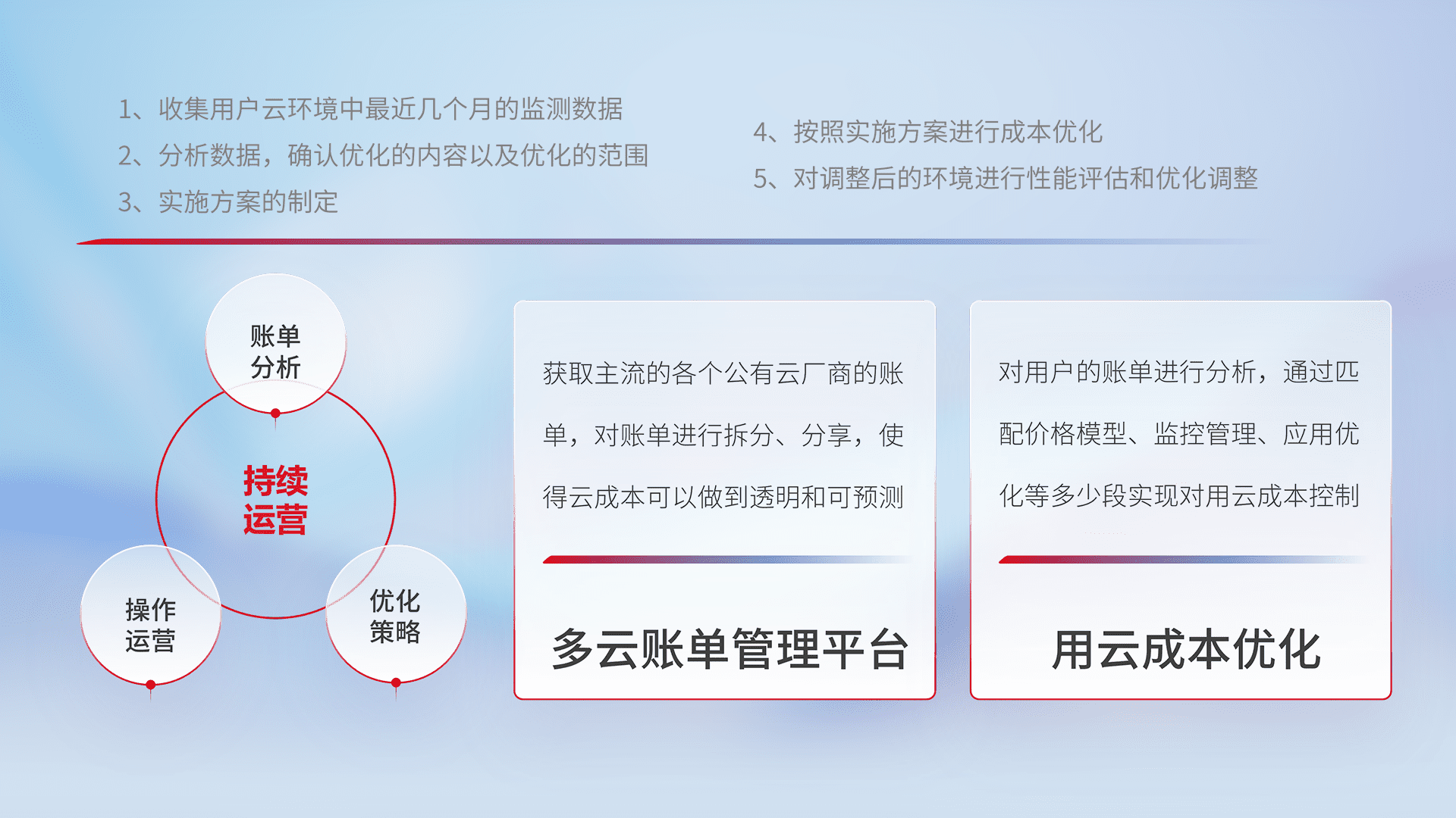 通过多云纳管,,,,以统一的资源数据模型把客户的云资源进行抽象和封装,,,进而实现对多云资源的统一操作,,,,保障云资源管理的可靠性、、、、稳定性与可用性。。量身定制化运维内容,,配置、、、开发运维、、、、补丁管理、、备份、、、监控、、、、认证和访问管理、、、、审计和日常巡检等,,保障在用云过程中的可靠度,,稳定度以及高可用率。。。。